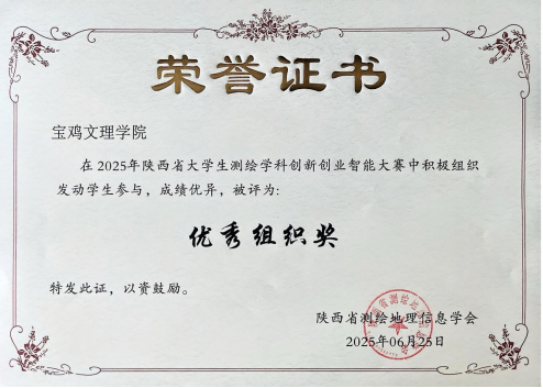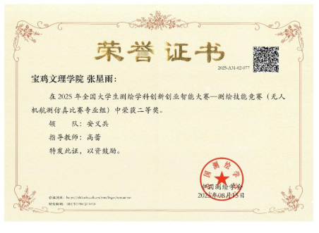 7月31日,由中国测绘学会教育工作委员会主办,内蒙古科技大学承办,广州南方测绘科技股份有限公司协办的“2025年全国大学生测绘学科创新创业智能大赛”在内蒙古科技大学正式开幕。该赛事是全国大学生展示测绘科技创新的最高级别赛事。经过省赛及国赛模拟热身赛的综合考量,我院派出11名学生参加比赛,其中,高蕾老师指导的2023级张星雨获得无人机航测仿真比赛(专业组)二等奖。